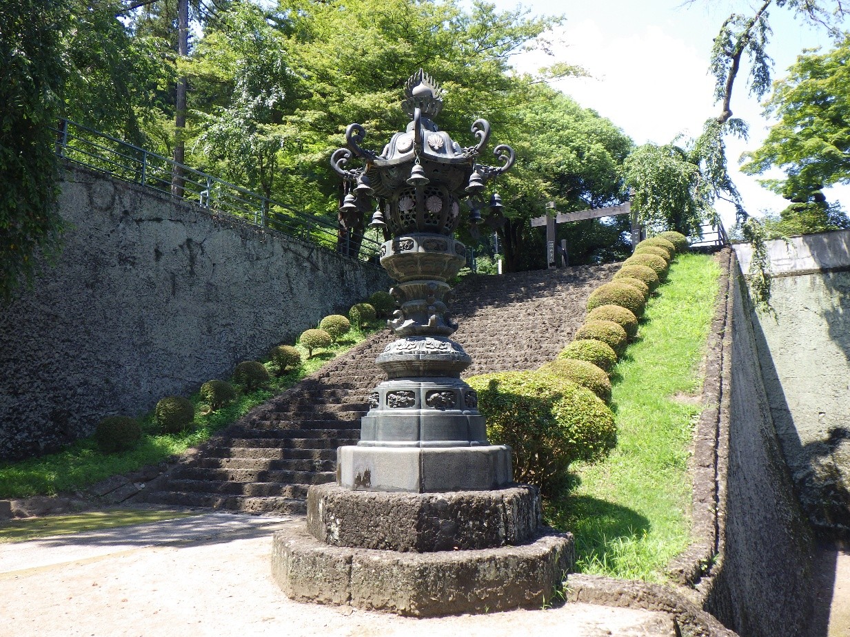 妙義神社入り口の階段の手前に建つ総高4.35mで一対の青銅製の燈籠です。元治元年(1864)6月、「養蚕倍盛・商売繁盛」を祈願して諸国の糸繭商人、諸商人、養蚕家の人々など合計223人の寄進により建てられました。