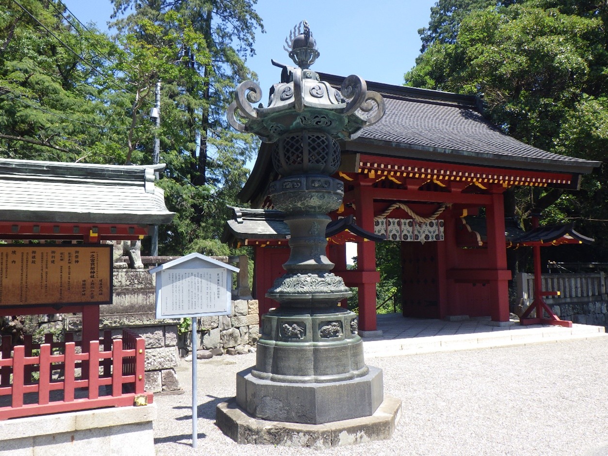 貫前神社総門の前に建てられた高さ3.95mの一対の青銅製の燈籠で、慶応2年(1866)に、養蚕や生糸生産の繁栄興隆を願って建てられました。県内各地の養蚕農家や生糸商人、さらには東京や横浜の生糸・絹商人合計1,544人が献金しました。