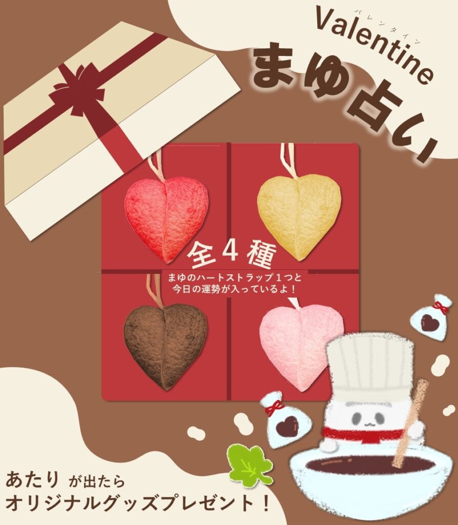 バレンタインの運勢が書かれたうらない付きのハートのまゆストラップが景品です。