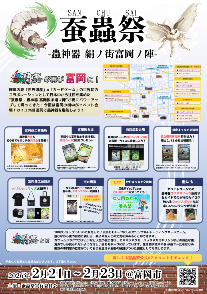 株式会社大創産業と、世界遺産・富岡製糸場とのコラボレーションイベントとして、DAISO オリジナルトレーディングカードゲーム「蟲神器」を テーマにした「蚕蟲祭 –蟲神器 絹ノ街 富岡ノ陣–」を開催します。